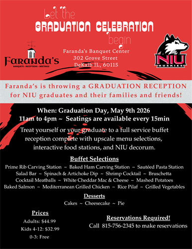 Celebrate your graduate’s big achievement at Faranda’s with a special NIU Graduation Celebration on commencement day. This family-friendly event features an upscale buffet experience designed to bring everyone together before or after the ceremony.