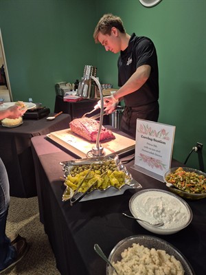 Guests will enjoy a premium spread including chef-attended carving stations with prime rib and baked ham, a sautéed pasta station, fresh salad bar, and a full buffet featuring salmon, Mediterranean grilled chicken, classic sides, and more. The menu also includes appetizers like shrimp cocktail and spinach artichoke dip, plus a dessert selection of cakes, pies, and cheesecake.
